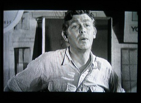 An early scene from Elia Kazan’s A Face in the Crowd, presented with an overly severe aspect ratio (seemingly 1.85 to 1) on an upcoming (5.10) Warner Home Video DVD. Notice the top of the frame scissoring into Andy Griffith’s pompadour.