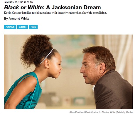 “It takes bravery for Kevin Costner and Mike Binder to go up against the strange phenomena of whites who no longer believe in themselves but assume guilt, and of blacks who assume entitlement. Both are typically disingenuous and untrustworthy progressive positions on racial problems, as in Selma. The title of Costner’s film makes a statement; yet, like Michael Jackson’s hit record, it also poses several questions: First about family, then character, then social values, and lastly about race. That may seem like backward priorities, given the way race has recently dominated film culture. But the order of the film’s interests suggests Costner’s integrity regarding showbiz moralizing.” — from Armond White’s 1.30 review of Black or White.