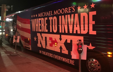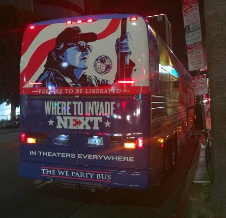 I was near the Cinerama Dome last night when a big, nicely-designed Where To Invade Next bus pulled up and parked right on Sunset. At first I was expecting director-writer Michael Moore to step out but no — the bus just sat there. Presumably it’s a kind of roving billboard thing, making its way around town and parking near big movie theatres…something like that.