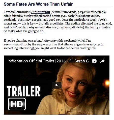 James Schamus‘s Indignation opened in four theaters this weekend. It earned $89,072 for an average of $22,268 per situation. In my 7.26 review I wrote that it’s worth seeing for a 16-minute argument/debate scene between Logan Lerman (as a Newark-born freshman at an Ohio college) and Tracey Letts (as the college dean). Here’s a Village Voice piece about the writing and filming of this scene. I called Indignation a “respectable, adult-friendly, nicely refined period drama (i.e., early ’50s) about values, academia, obstinacy, surprisingly good sex, Jews (in particular a tough Jewish mom) and — this is key — brutally cruel fates.” I explained that “the ending alienated me to no end.” Did anyone happen to catch it? If so, any thoughts about the third-act windup and the fates that envelop Lerman’s Marcus Messner and Sarah Gadon‘s Olivia Hutton?