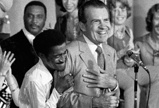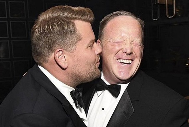 In a just, fair-minded world, this photo of James Corden kissing (!) Sean Spicer at the Emmys last night would be processed as the same kind of political faux pas as Jimmy Fallon mussing Donald Trump’s hair. Or, if you will, Sammy Davis, Jr. hugging President Nixon at a 1972 youth rally. Or the big studio chiefs of the early ’30s giving handshakes and back-pats to Georg Gyssling, the Nazi party member and ally of Joseph Goebbels who became the German consul to Los Angeles in 1933. Does Corden seem to be a soul-less, gut-less, unprincipled toady? Yes, he does. If Corden could be transported back to 1975 and flown to Phnom Penh, would he give a backrub to Pol Pot? I see Corden and Spicey singing Queen’s “Bicycle Race” together…no?