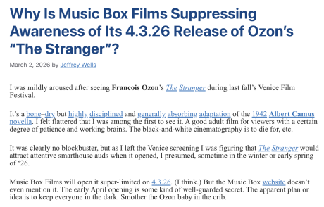 Two days ago (4.2.26) I asked why Music Box Films is “suppressing awareness” of its 4.3.26 release of Francois Ozon‘s The Stranger, which premiered six months ago at the 2025 Venice Film Festival. I called these lazy bones out on the carpet, you bet. Today, shaken out of their lethargy, the Music Box guys finally got their act in gear by releasing a Stranger trailer.