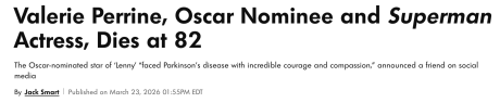 Perrine costarred in the first two Chris Reeve Superman films, of course, playing Lex Luthor’s (i.e., Gene Hackman‘s) girlfriend, Eve Teschmacher.