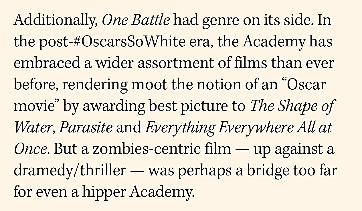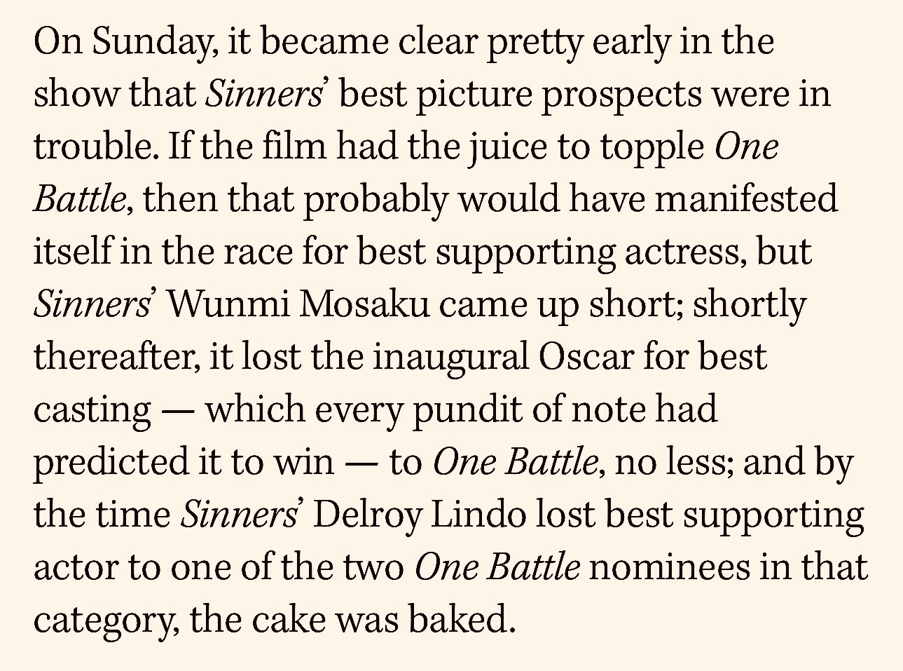HE-posted at 8:20 pm eastern: “Anyway, it’s over. One Battle After Another taking the inaugural Best Casting Oscar plus Sean Penn beating Lindo and Sarsgard in supporting means Sinners isn’t winning Best Picture. Yes! Yes! It’ll be OBAA.”