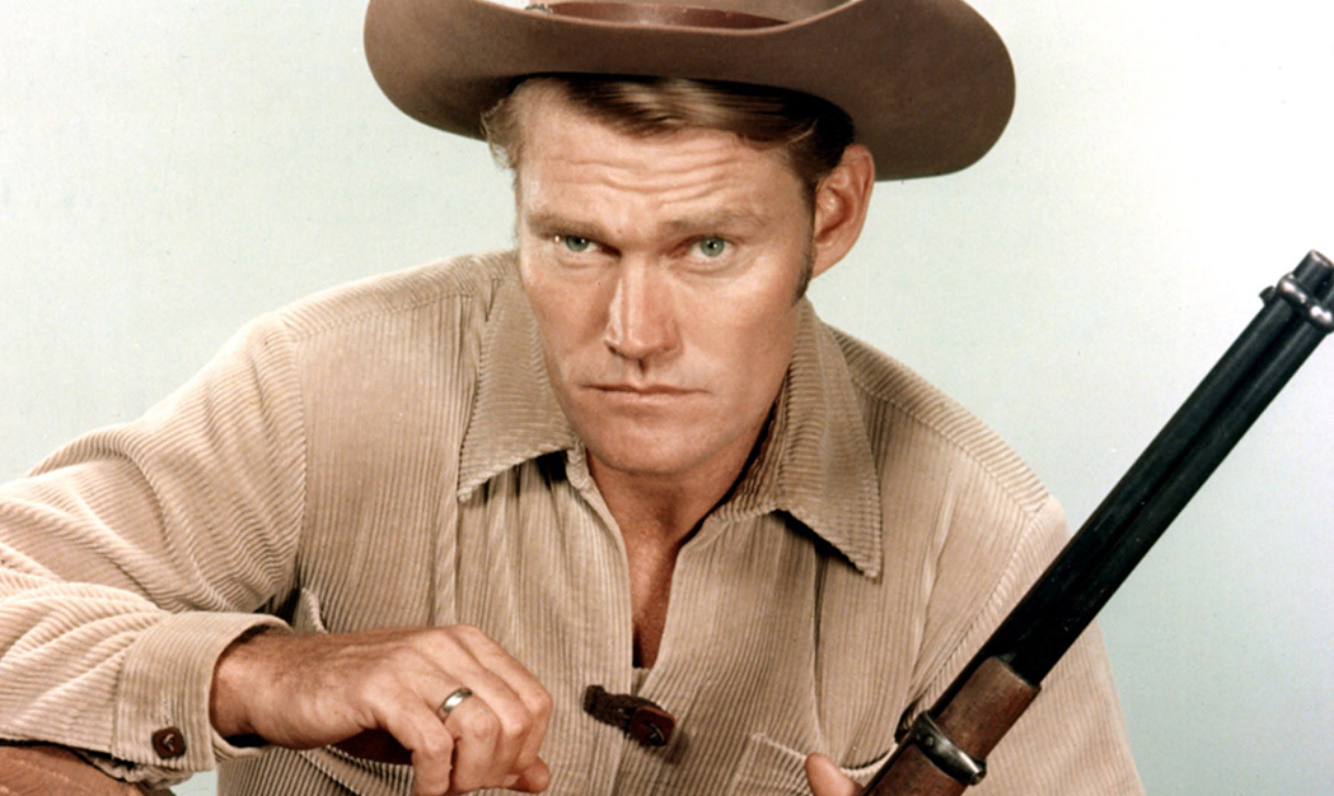 If Chuck Connors never did anything else, that look he gives the camera after firing off 12 shots from his specially modified Winchester 44-40 model 1892 would be enough. He doesn’t glare, doesn’t scowl, doesn’t smirk, doesn’t grin or suggest any kind of cockiness, and yet that look in his eyes manages to say “this is what I do, take it or leave it — I drill guys over and over, pretty much every week, and yet I’m even-tempered and respectable and so the law’s always on my side…pretty good deal, eh?” Yeah, it is. But who ever heard of a Winchester that fires 12 shots in a row? Look at it — where would 12 cartridges even fit?