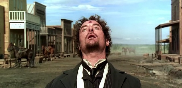 My favorite all-time western gunfight, and that includes the Wild Bunch finale. And it’s not just those magic six-shooters that are capable of firing 15 or 20 rounds without reloading. It’s also that cannon-like sound when they fire. Perhaps not as roaring rumbling thundercloud as the gunshots in Shane, but in the same basic neighborhood.