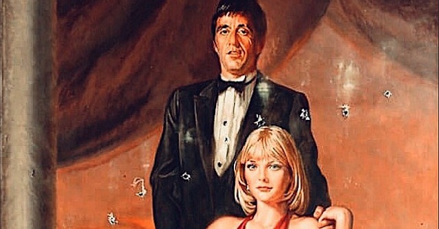 Hanging on a wall near the base of the staircase was a fairly large (at least six or seven feet tall) oil portrait of Al Pacino‘s Tony and Michelle Pfeiffer‘s Elvira Hancock. I’m no authority on oil portraits, but it looked like an absolutely first-rate effort. Someone had taken the time to make it look like a serious artist (one who knew from color and shadow and subtle gradations) had worked on it. In the film the painting is seen for maybe 1.5 seconds, if that.