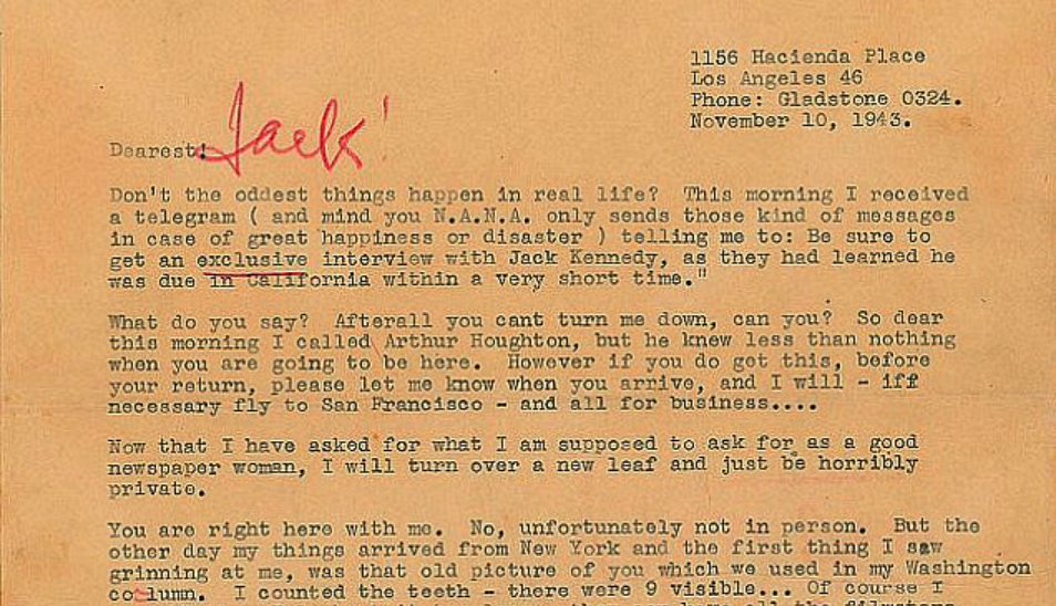 All this time I thought that John F. Kennedy‘s nickname for Inga Arvad (“Inga Binga”) was some kind of snickering locker-room allusion. It always sounded to me like a somewhat derogatory term that suggested a certain impassioned aptitude in the sack. A couple of days ago I came upon this WWII-era letter (dated 11.10.43) that Arvad sent to JFK. Her signature seems to read “Inga Binga.” It seems, in other words, to have been a nickname that she accepted, at least when it came to communicating with JFK. At the time Arvad was living at 1156 Hacienda Place, a West Hollywood address just south of Fountain and north of Santa Monica Blvd.