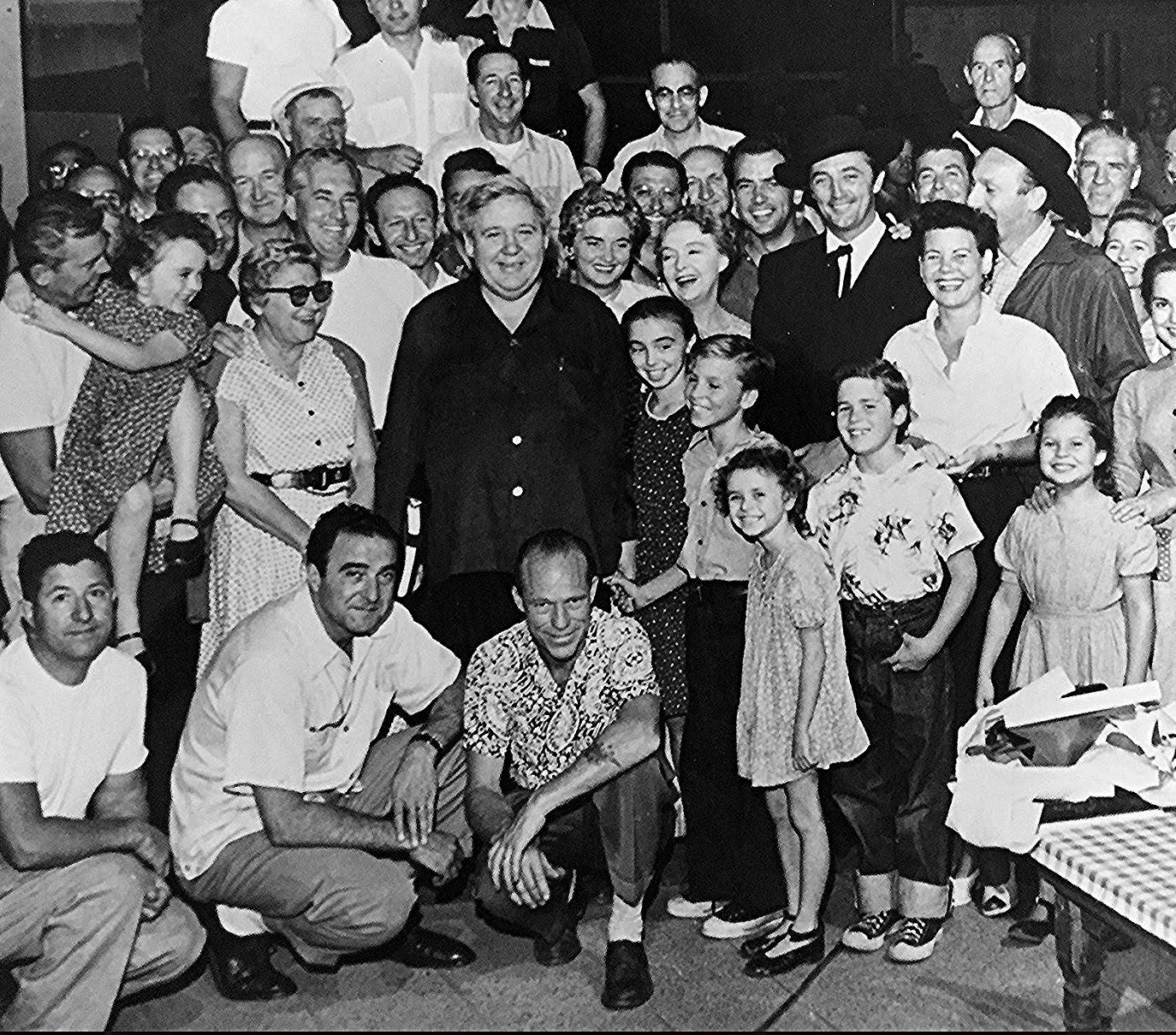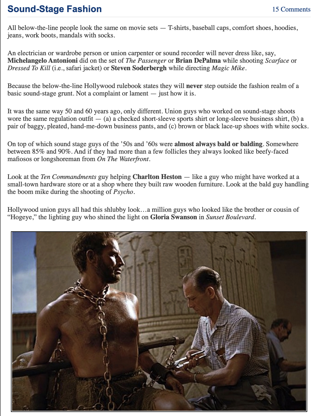 Yesterday I found this photo of the cast and crew of The Night of the Hunter. Principal photography began on 8.15.54 and ended on 10.7.54 — 36 days total. The photo was probably taken on the final day. (Where was Shelley Winters?) I had two reactions. One, I loved the tickled smiles worn by director Charles Laughton and lead actor Robert Mitchum. And two, I was taken aback by the white socks worn by the two kneeling crew guys. In an April 2020 piece called “Sound-Stage Fashion,” I noted the dress code of the average below-the-line Hollywood sound-stage grunt in the mid ’50s. The outfit consisted of (a) a checked short-sleeve sports shirt or long-sleeve business shirt, (b) a pair of baggy, pleated, hand-me-down business pants, and (c) brown or black lace-up shoes with white socks.