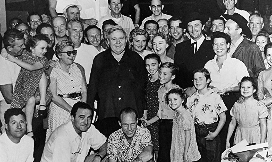 Yesterday I found this photo of the cast and crew of The Night of the Hunter. Principal photography began on 8.15.54 and ended on 10.7.54 — 36 days total. The photo was probably taken on the final day. (Where was Shelley Winters?) I had two reactions. One, I loved the tickled smiles worn by director Charles Laughton and lead actor Robert Mitchum. And two, I was taken aback by the white socks worn by the two kneeling crew guys. In an April 2020 piece called “Sound-Stage Fashion,” I noted the dress code of the average below-the-line Hollywood sound-stage grunt in the mid ’50s. The outfit consisted of (a) a checked short-sleeve sports shirt or long-sleeve business shirt, (b) a pair of baggy, pleated, hand-me-down business pants, and (c) brown or black lace-up shoes with white socks.