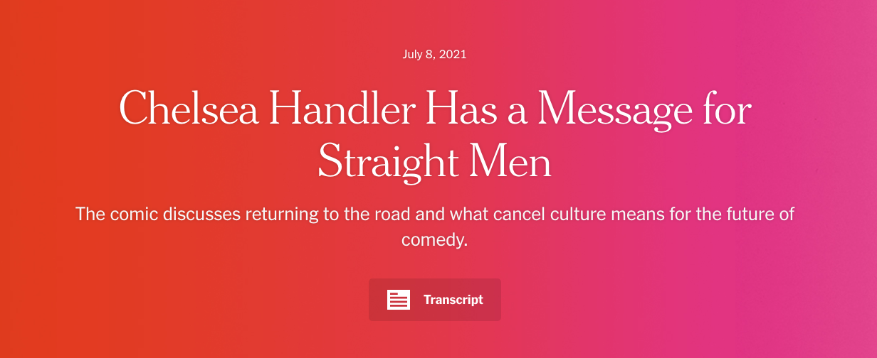 Chelsea Handler to N.Y. Times columnist/podcaster Kara Swisher in 7.8.21 piece called “Chelsea Handler Has A Message for Straight Men“: