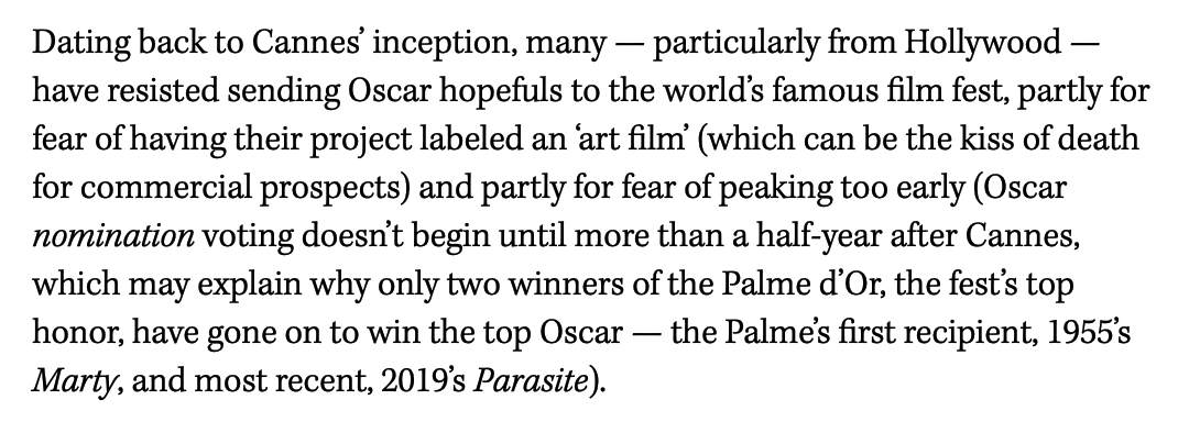 Regarding Scott Feinberg‘s 7.5.21 THR story, “Cannes: Which Fest Films Could Become Oscar Contenders?“, and the opening paragraph in particular: