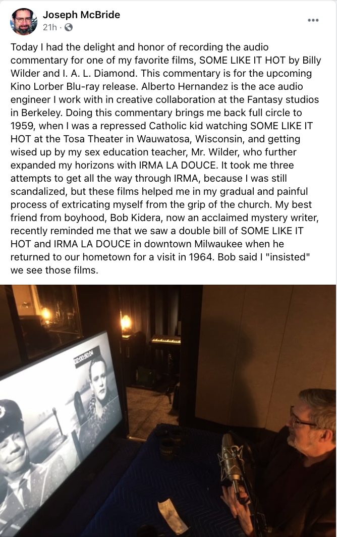 Yesterday Joseph McBride, author of the forthcoming “Billy Wilder: Dancing on the Edge” (Columbia University, 10.26), announced on Facebook that he’d just recorded a commentary track for a forthcoming Kino Bluray of Wilder’s Some Like It Hot (’59).