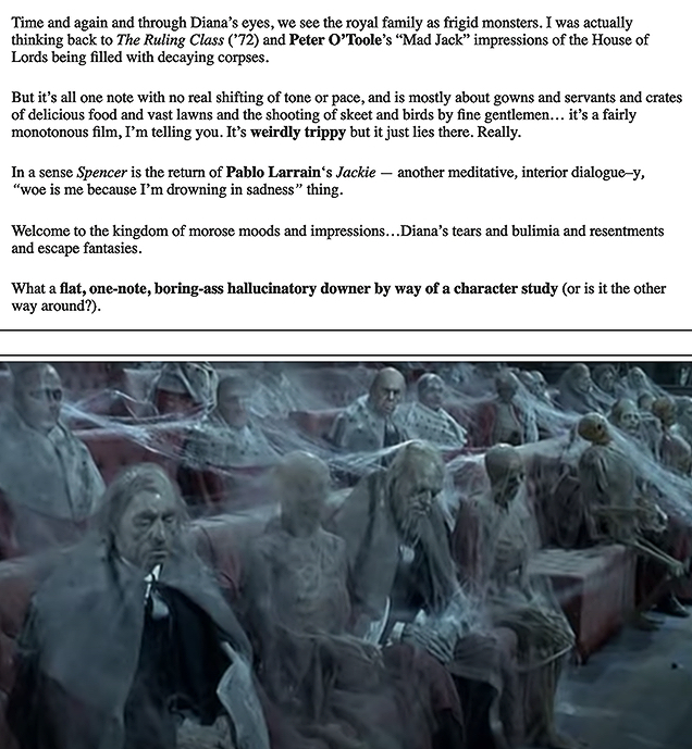 Filed on 9.4.21: I’ve said before that Pablo Larrain‘s Spencer (Neon/Topic, 11.5) is agony to sit through. It’s a simplistic, impressionistic head–trip film…a “poor free-spirited, pheasant-sympathizing, pearl necklace-loathing Diana vs. the cold, bloodless gargoyle royals” bullshit borefest.