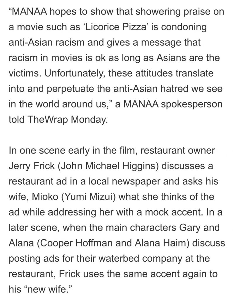 …and in so doing proclaim your hyper–sensitivity and wokeassholery for the benefit of all your social media pallies. I’ve half a mind to drive to Westwood to pay to see Paul Thomas Anderson’s modest and meandering period dramedy again, as a way of saying “many of us hear you, MANAA homies…we get what you’re saying, but PTA was being honest to the period, you see, and his refusal to follow the presentism crowd is an honorable thing.”