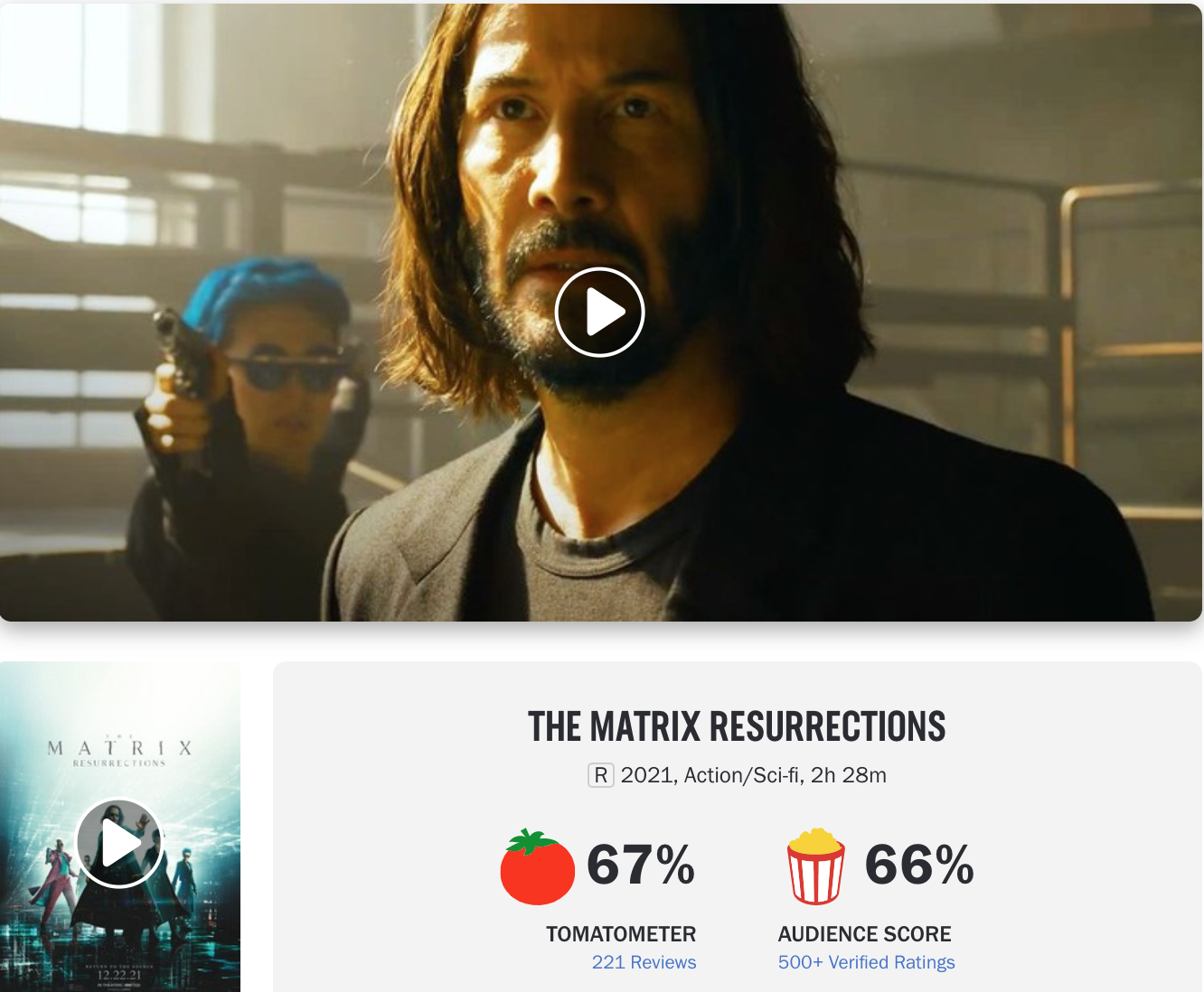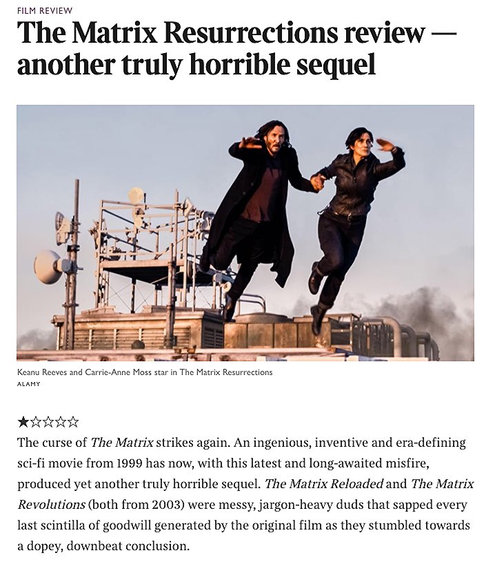 Fuck this movie for further tarnishing the memory of the original 1999 The Matrix, which I’ll always love. Everything I hated about The Matrix: Reloaded and The Matrix: Revolutions — the horrible sense that a good idea is being mangled and twisted and then lost in the shuffle…those awful 2003 vibes are delivered in industrial-strength doses in Resurrections. It starts out badly or clumsily or ever-emphatically (less than ten minutes I sat up the couch and said out loud “this is bad”), and then it gets worse and worse and still worse. I was dying by the end. It’s a horrible film.