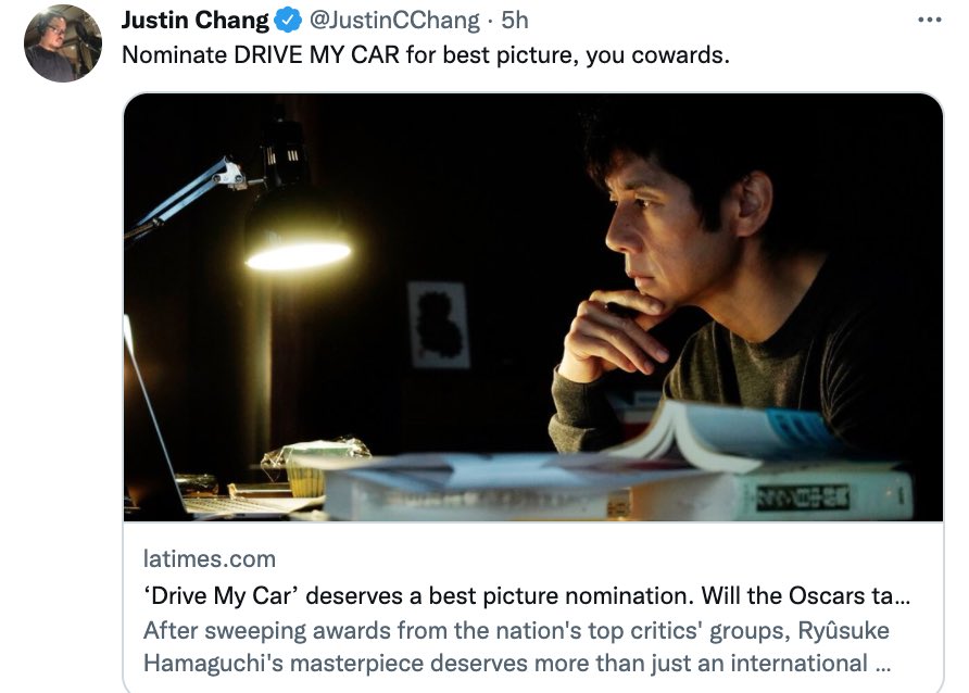 Drive My Car knows exactly what it’s doing, and it delivers on that mission and self-knowledge over a period of 179 minutes, which is unnecessary. A two-hour film that lasts 179 minutes can’t be uplifting or transcendent. DriveMyCar is a thoughtful, melancholy slog for griefmonkeys, and with way too many cigarettes smoked. It warrants respect but it shouldn’t leapfrog out of the Best Int’l Feature category. Meditative smarthouse material for Justin Chang-level elites and hoity-toities. Hollywood Elsewhere says “sorry but no Best Picture nomination.”
