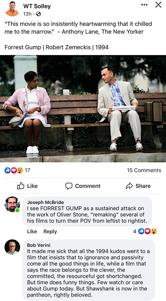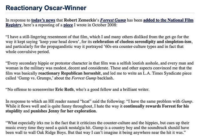 I’ve been expressing contempt for and disapproval of Forrest Gump for over 27 years. My first hit piece, “Gump vs. Grumps,” was written for the L.A. Times Syndicate in late ‘94. The first HE post that deplored this homespun Robert Zemeckis-Tom Hanks fantasy appeared in ‘08. WTSolley’s anti-Gump Facebook rant appeared last night, and that got me going again.