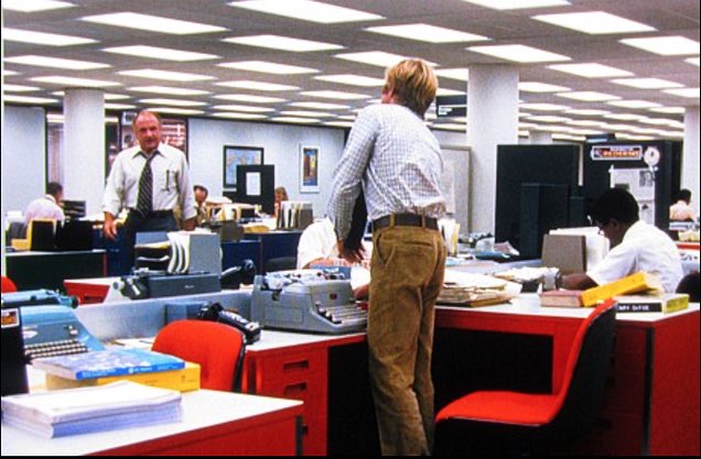 The late Gordon Willis‘ visual signature was “the Prince of Darkness” — deep, inky, mine-shaft blacks. And yet his Washington Post newsroom in All The President’s Men was accented with bright, eye-poppy colors. Because Willis had adapted to the reality of the setting (or so I’m assuming), and he wasn’t an obsessive.