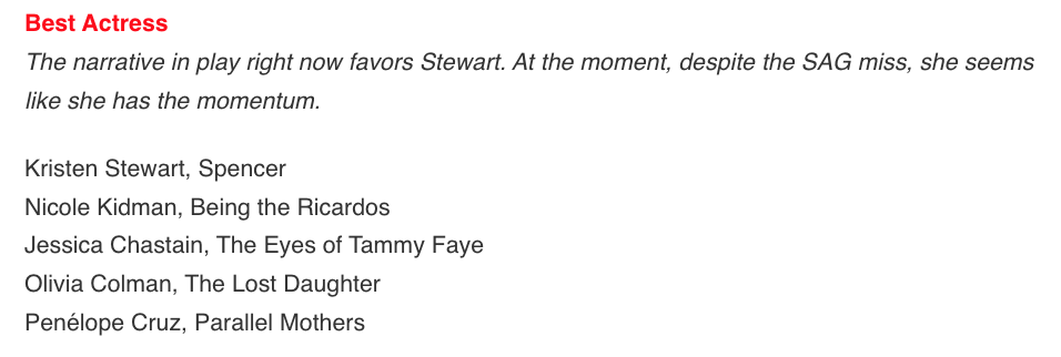 Awards Daily‘s Sasha Stone is actually predicting (or half-predicting by way of an intuitive feeling) that Spencer‘s Kristen Stewart might be…well, a slightly more likely winner of the Best Actress Oscar race than some of us are supposing. Or so she suspects. Nobody knows anything, of course.