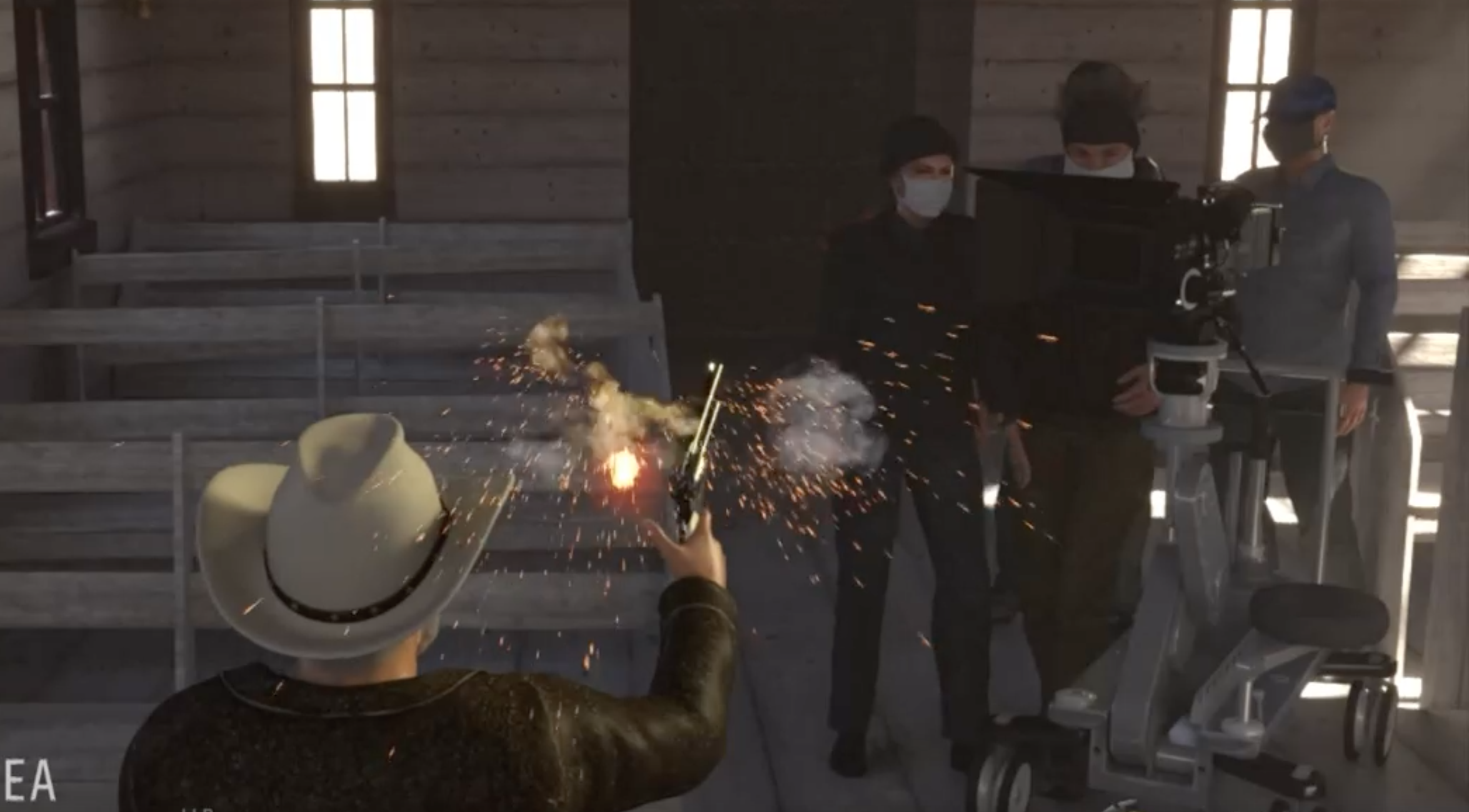 Created by DK Global’s Panish Shea and Boyle Ravipudi (or is it Panish Boyle and Shea Ravipudi?), this is a digital reenactment of the tragic shooting of the late Halyna Hutchins on the set of Rust on 10.21.21. It illustrates a 2.15.22 TMZ story about Baldwin named as a defendant in a wrongful death lawsuit filed by Hutchins’ family. We see an Alec Baldwin-resembling video-game character pull a pistol out of a left-shoulder holster, aim it in the direction of Hutchins and BLAM! Baldwin has claimed he never pulled the trigger — that it went off on its own.