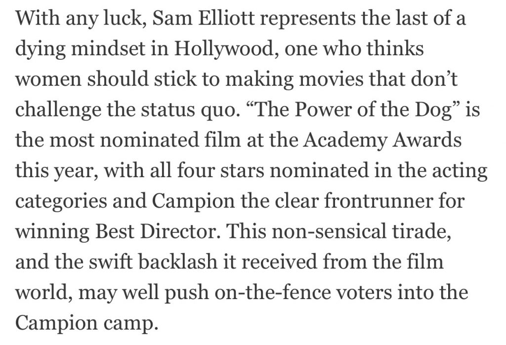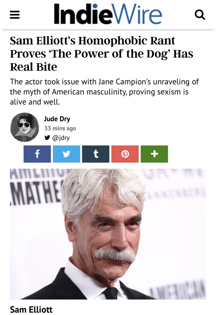 Leave it to IndieWire (aka “Woke Central”) to run a slam piece that accuses Power of the Dog disser Sam Elliott of spewing a “wild tirade” of “sexism and homophobia.”