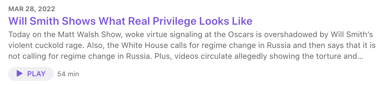 “This is a beautiful moment…[but] I want to apologize to the Academy…here I am, being the crazy father, the crazy father…love will make you do crazy things…thank you for this honor, thank you for this moment.” — fragments from Will Smith‘s acceptance speech after winning the Best Actor Oscar for his performance as Richard Williams in King Richard.