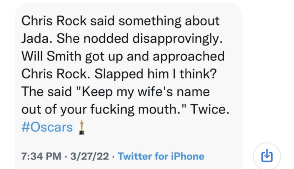 “So I am not Will Smith, and thank you very much for allowing me to make things clear in this regard. I don’t tolerate cruelty or hurting a woman’s feelings or in any way humiliating her in front of others, but I do believe in settling things outside and privately, face to face and eyeball to eyeball.”