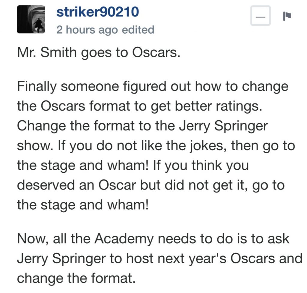 Still in the toilet but at least they defied Richard Rushfield’s prediction (or morbid suspicion) that they might drop below last year’s calamitous tally of 10 million viewers. And after Will Smith’s bitch-slapping of Chris Rock you know that a certain low-rent sector of the public will tune in next year in hopes of something similar happening. Onward and upward!