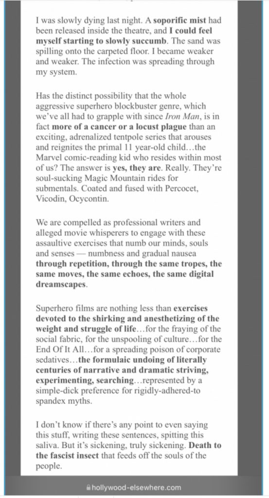 This anti-Marvel rant (from a review posted in the mid teens) is solemnly felt and well phrased: