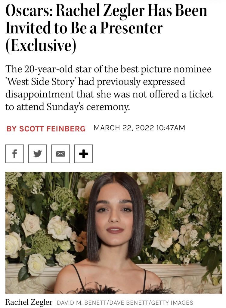 THR’s Scott Feinberg is exclusively reporting that West Side Story’s Rachel Zegler will not be watching the 94th Oscars from her couch after all, but will attend the ceremony as an Oscar presenter. This is like Cinderella attending the grand ball in her glass slipper.