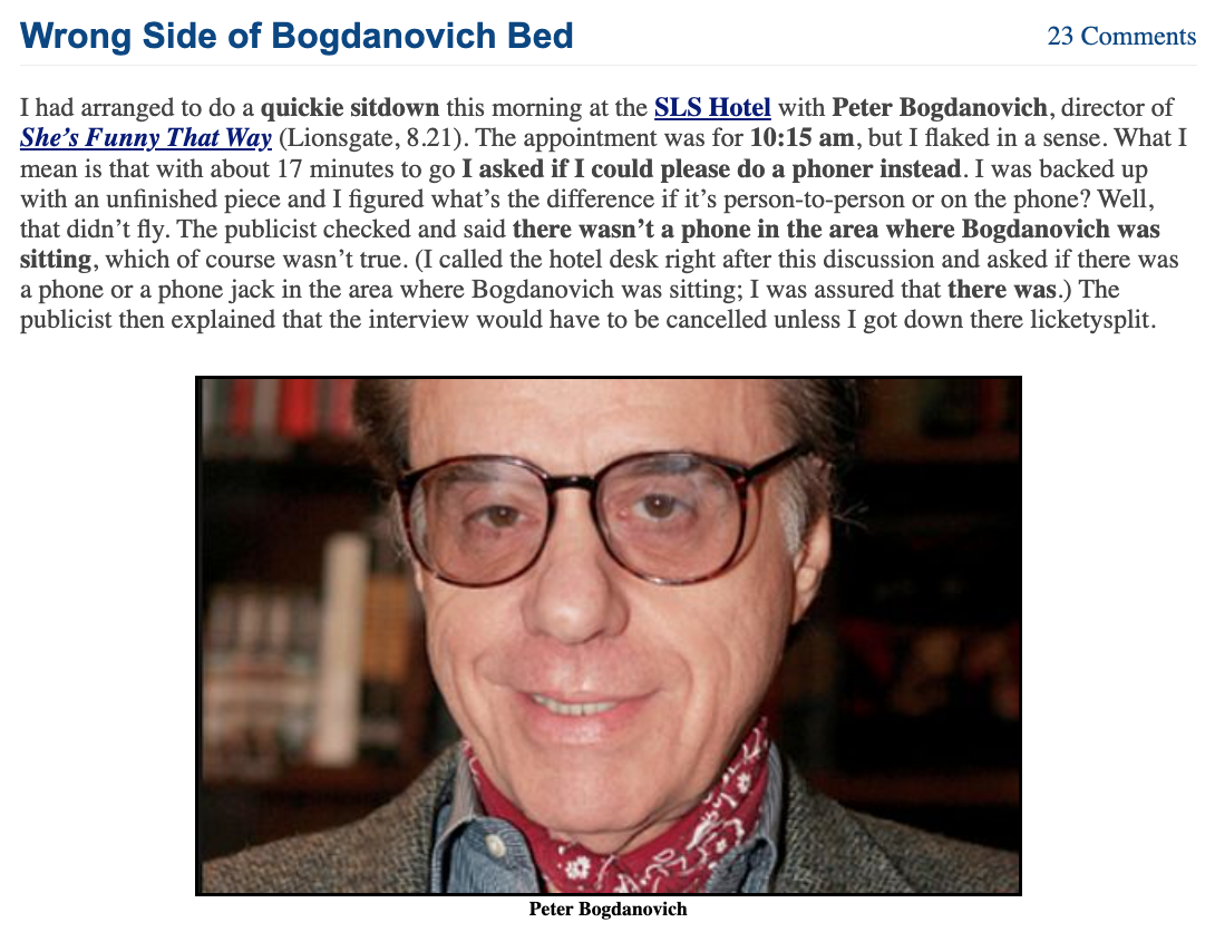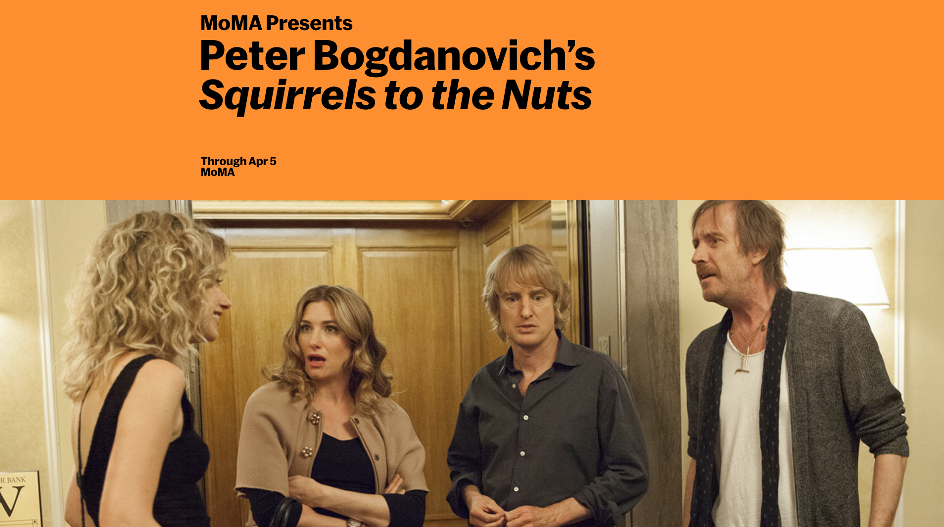 Squirrels To The Nuts is said to be a much better film than She’s Funny That Way. (“In its full, free-floating form, Squirrels recovers Bogdanovich’s elegance, airiness, and ability to smoothly manage a large cast of characters,” according to the MOMA notes.) I didn’t care for She’s Funny That Way, but I’d love to see Squirrels. Perhaps it’ll screen at one of the American Cinematheque houses down the road.