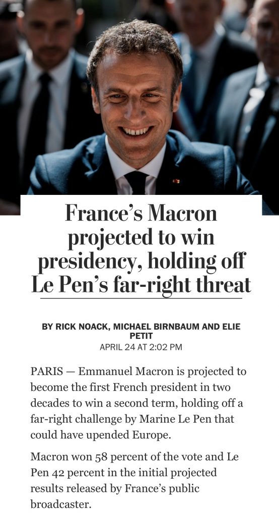 Over the last two or three weeks I read several articles about the seemingly close race between French president Emmanuel Macron and his arch-conservative, Putin-favoring challenger, Marine Le Pen. The general tone of the pieces was alarmist…”the sky might be falling!”