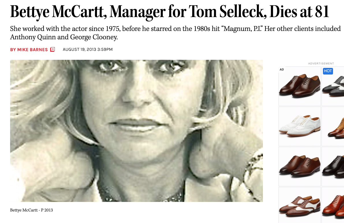 “McCartt started working with Tom Selleck as both his agent and manager in 1975. When the actor signed with CAA in 2008, she continued as his manager until her death [in August 2013].”