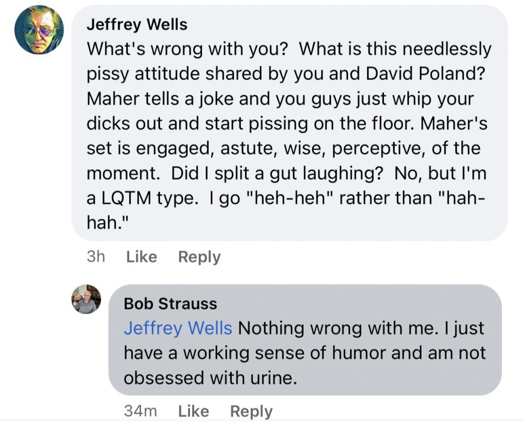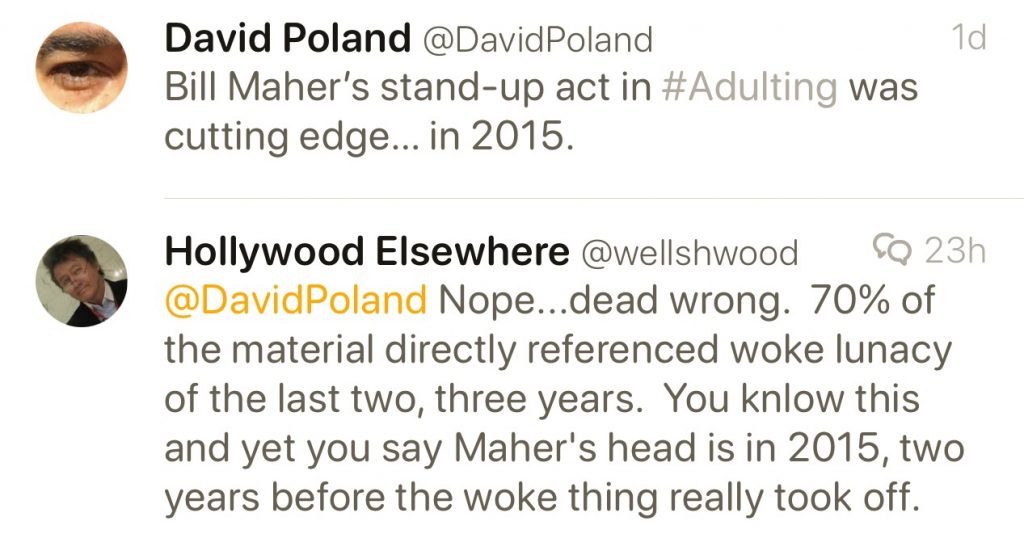 Maher: “[Gone With The Wind], by the way…entertaining as fuck, and the people who need a disclaimer [about the 83-year-old racist content]…this is the problem, you fucking babies. Can’t you just see by the film stock that things were very different back then? History in general, we evolve. Just celebrate that we are not [as] racist any more. This generation [Millennials] needs a trigger warning and a Klonopin to get through an episode of [something or other].”
