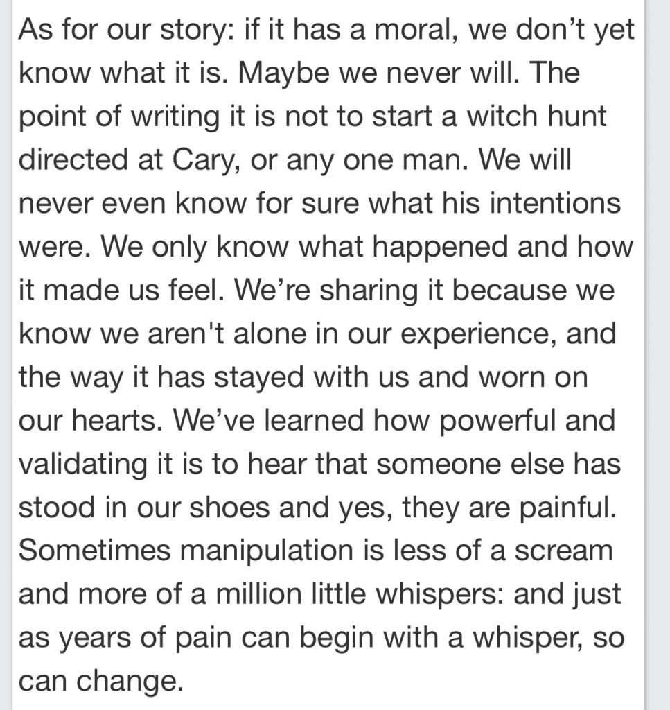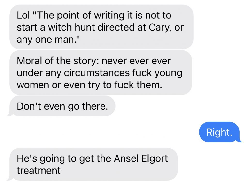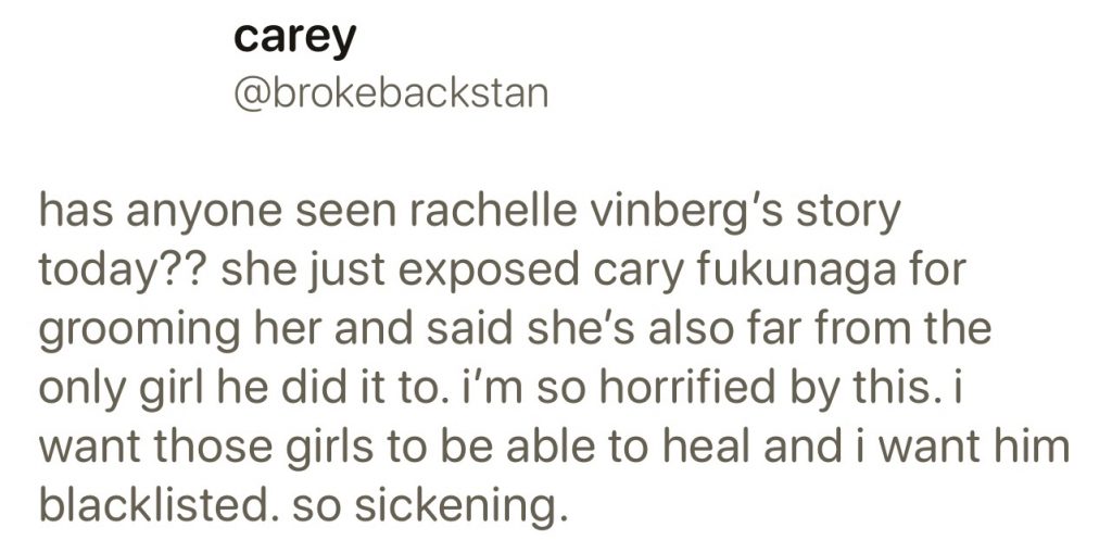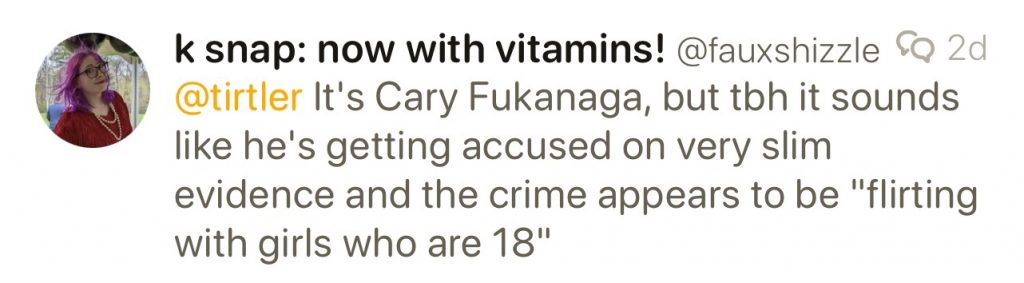 Over the last day or two there have been twitter conversations about whether or not Fukunaga should be punished for…well, it’s a little vague. For possibly attempting to groom the Loesch sisters into something or other…maybe a casual ménage a trois relationship….you tell me. Except nothing actually happened.