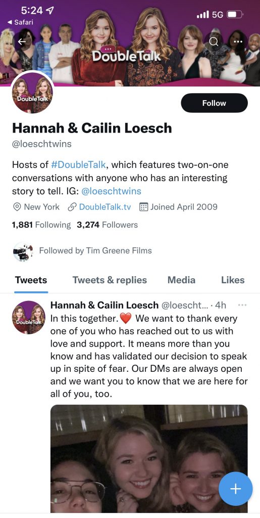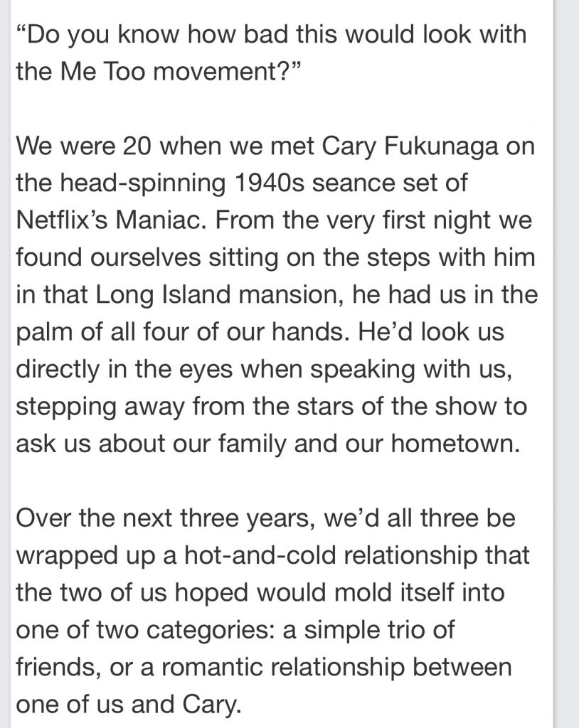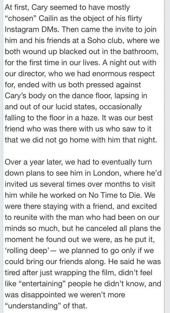 Read this story (dated May 5th) about a somewhat “close”, flirtatious but mostly hands-off relationship between director Cary Fukunaga (No Time To Die) and Hannah and Cailin Loesch, hosts of #Double Talk (aka @loeschtwins).