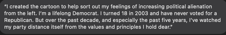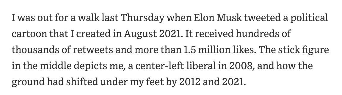 From “Elon Musk Tweeted My Cartoon,” a 5.2 opinion piece by Colin Wright. The subhead reads “Commentators on the left set about debunking my ‘lived experience’ with charts and abstractions.”