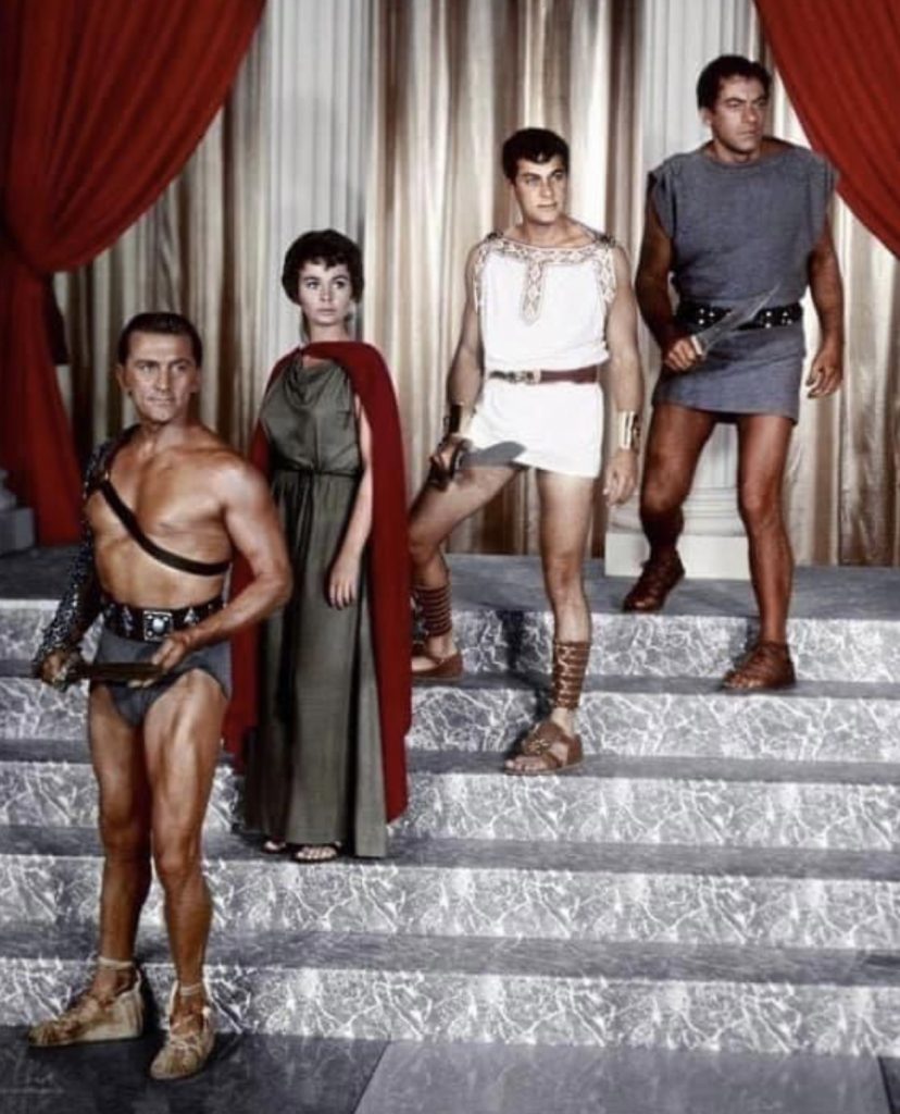 Please note a similarity between the platform-heeled, ankle-strap sandals worn by Kirk Douglas in this Spartacus publicity still and a pair worn earlier today by Tatiana Antropova. Okay, her heels are higher but still.