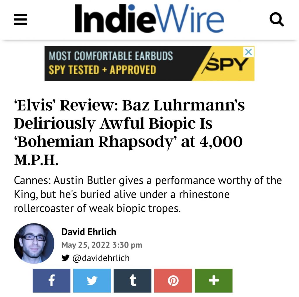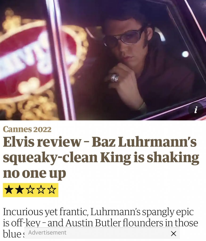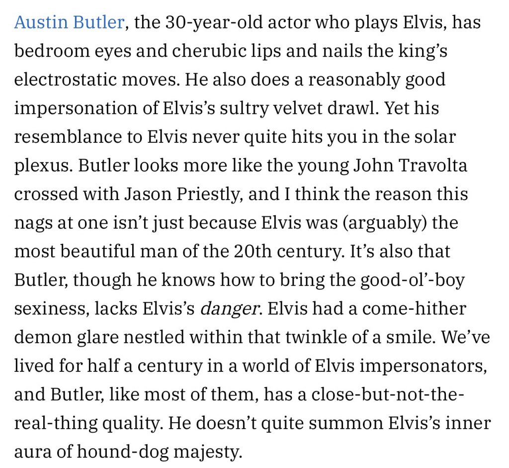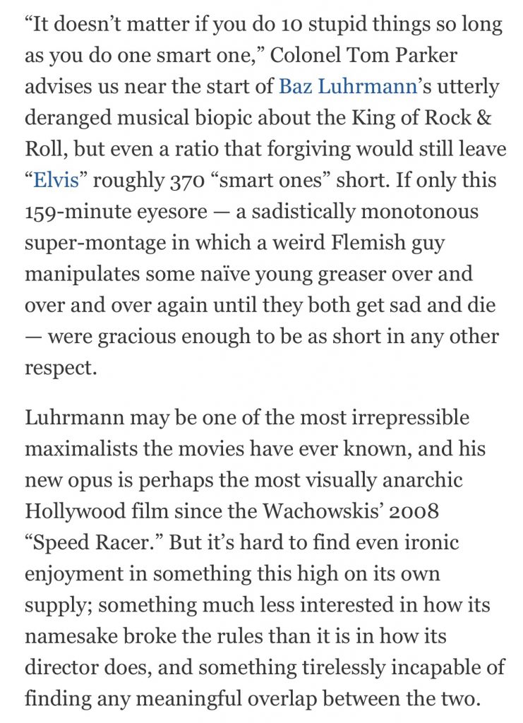 7:40 am: Years of movie-watching have taught me that if a new film’s reviews are on the disappointed, half-shitty side (as they certainly are for Elvis), the best thing to do, if I want to at least half-enjoy this allegedly shallow Baz Luhrmann sparkle-thon, is to swan-dive into the most negative assessments and let them cover me like liquid mud, so when I sit down with it myself (which will happen 50 minutes hence) I’ll emerge saying “hey, it wasn’t as bad as I’d expected!”