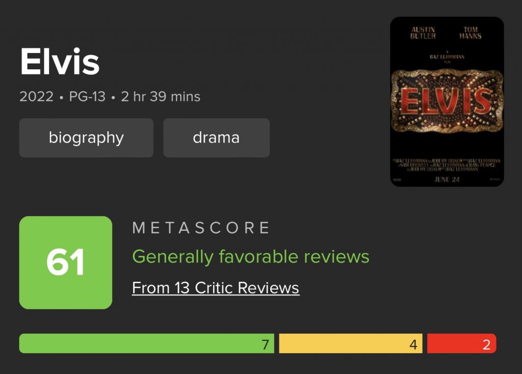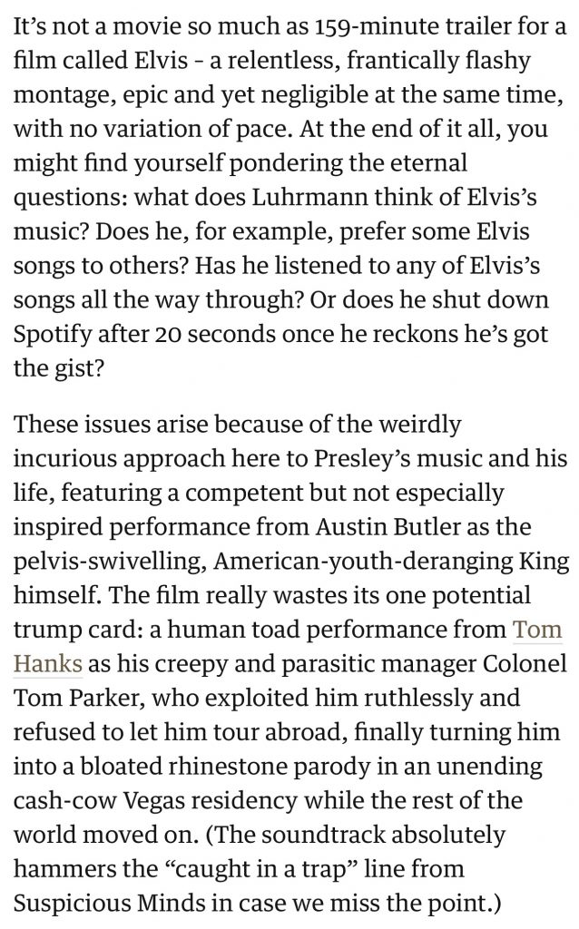 Baz Luhrmann understands the whole Elvis Presley story chapter-and-verse, and the film covers every last important or noteworthy story point, but God, what a crushing, staggering drag to hang out with fatsuit Tom Hanks (as Colonel Tom Parker) for 159 minutes.