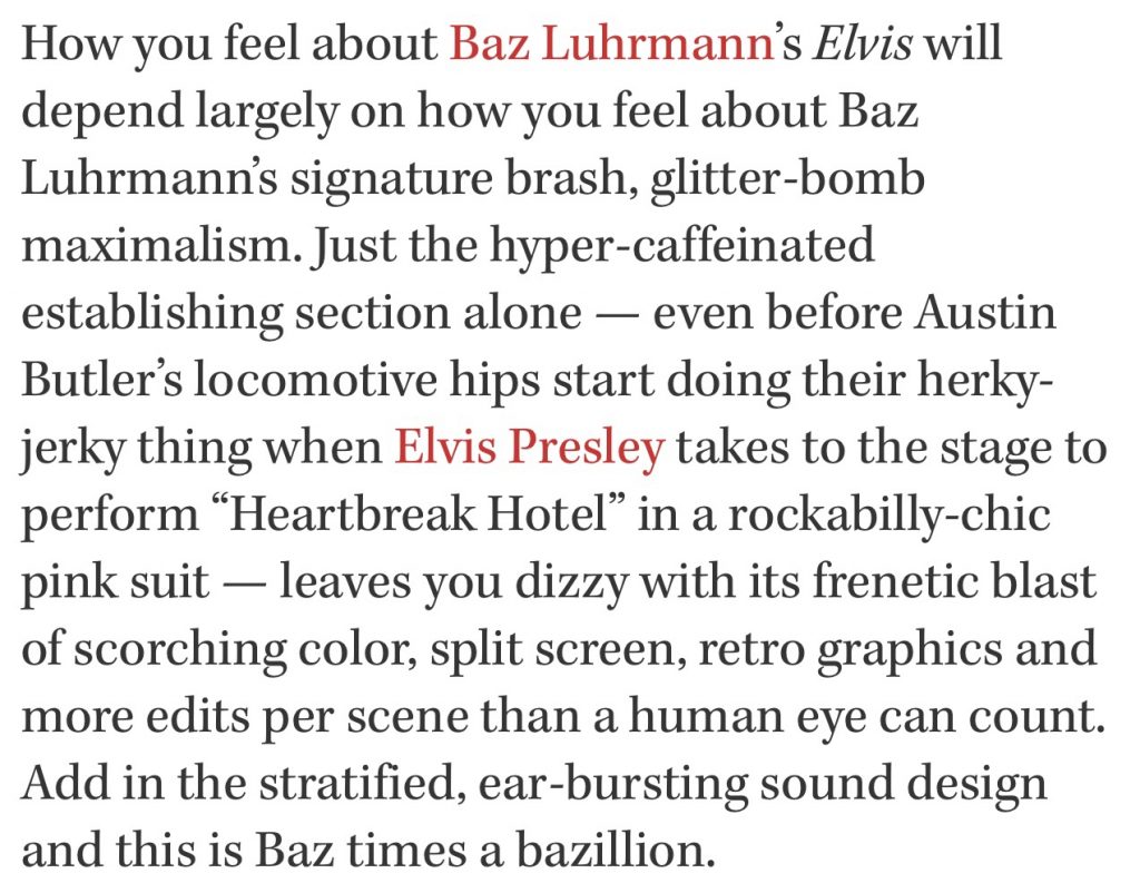 I adored the moment in which Elvis’s “Memphis mafia” (i.e., the principal parasites) is introduced as if part of a TV show opening-credits sequence. One of Baz’s best moments.