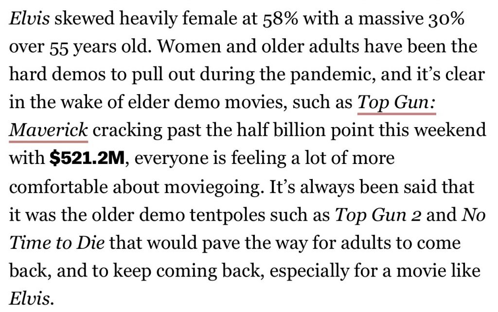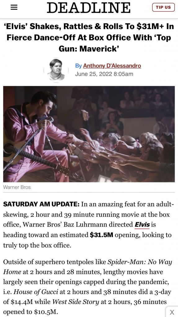 Despite a chorus of “uh-oh’s” from industry wise guys, Baz Luhrmann’s Elvis is not — repeat, not — a box-office shortfaller. It’s not Top Gun: Maverick but for a longish ADD biopic aimed at oldsters, it’s doing fairly well with a projected weekend tally of $31 million and change.