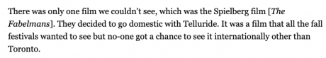 Barbera quote: “There was only one film we couldn’t see, which was the Spielberg film [The Fabelmans]. They decided to go domestic with Telluride. It was a film that all the fall festivals wanted to see but no one got a chance to see it internationally other than Toronto.”