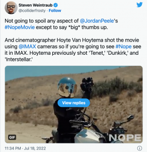 Jordan Peele‘s Nope opens on Friday, 7.22, which really means Thursday night. I’ll catch it at 7 pm this evening.