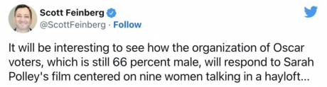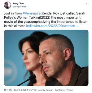 On the other hand THR‘s Scott Feinberg has derisively tweeted about the Telluride air being filled with “hyperbole”, a friend whispered to me last night that I’ll “hate it”, and another friend joked that Polley’s film is “strongly, almost hilariously anti-male.”