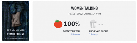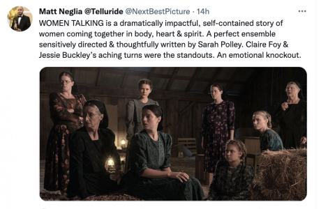 At the last minute I decided to bail on last night’s (6 pm) screening of Sarah Polley‘s Women Talking, an adaptation of Miriam Toews’ 2018 novel about eight Mennonite women confronting a horrific pattern of sexual assaults within their community. Because of the all-female ensemble factor (except for the allegedly wimpy Ben Whishaw character) and an allegedly gripping feminist current, Polley’s film is being hailed a Best Picture contender by a fair number of award-season sniffers (including Variety‘s Clayton Davis).