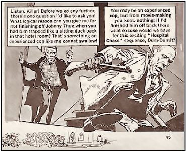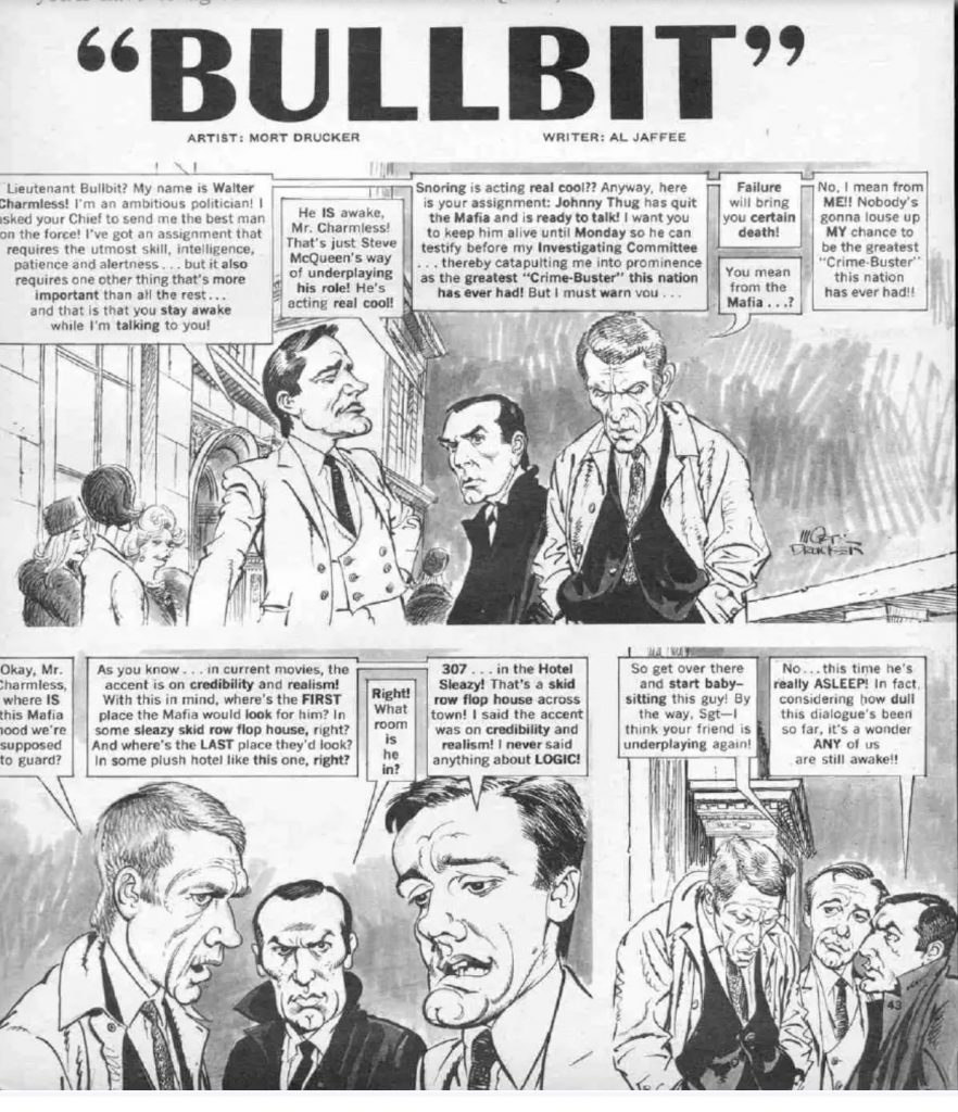 …posted by Mad Magazine in a June1969issue. I’ve never written about the flophouse “hit” scene in PeterYates’ Bullitt (‘68). A professional assassin, armed with a pump shotgun, nonsensically fails to do the job. Written by AlJaffee, drawn by MortDrucker .