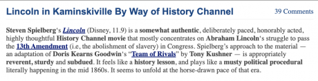 “Yes, I had Lincoln down as my own Best Picture prediction for a while but I did so with resignation and depression. From the beginning I saw Lincoln as a lazy default choice. It was just sitting there like a lump of mashed potatoes. I couldn’t wait to dump it after sensing a change in the wind.