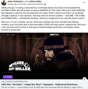 It’s not a rumor — some tiddly-wink at HBO Max has removed Warren Beatty‘s cigar from the McCabe and Mrs. Miller promotional art on the HBO Max menu. Ditto Paul Newman‘s cigar from HBO Max’s promotional art for The Life and Times of Judge Roy Bean.